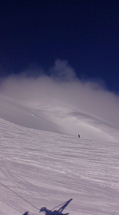まだ誰も滑ってない、まっさらなゲレンデを滑ると、CMみたいな雪埃!